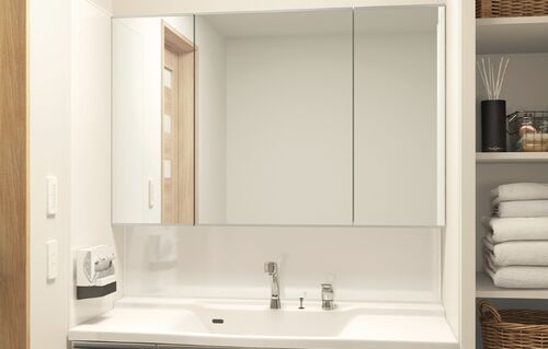 リジャストは、キャビネットや鏡を間口に合わせて、まるで特別注文のように1cm単位でサイズ指定できます。 収納内の整理整頓がしやすく工夫されているのもうれしいですね。少しの空きスペースも無駄にせず、すっきりとした大容量の洗面台を実現しました。 タ…